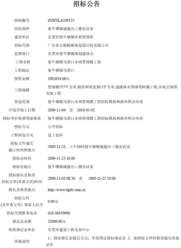 望牛墩镇马滘口水闸管理楼工程招标公告