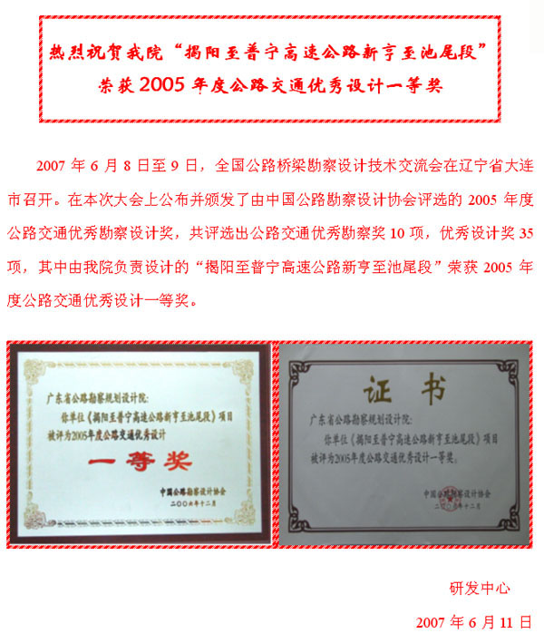 我院“揭阳至普宁高速公路新亨至池尾段”获05年度公路交通优秀设计一等奖