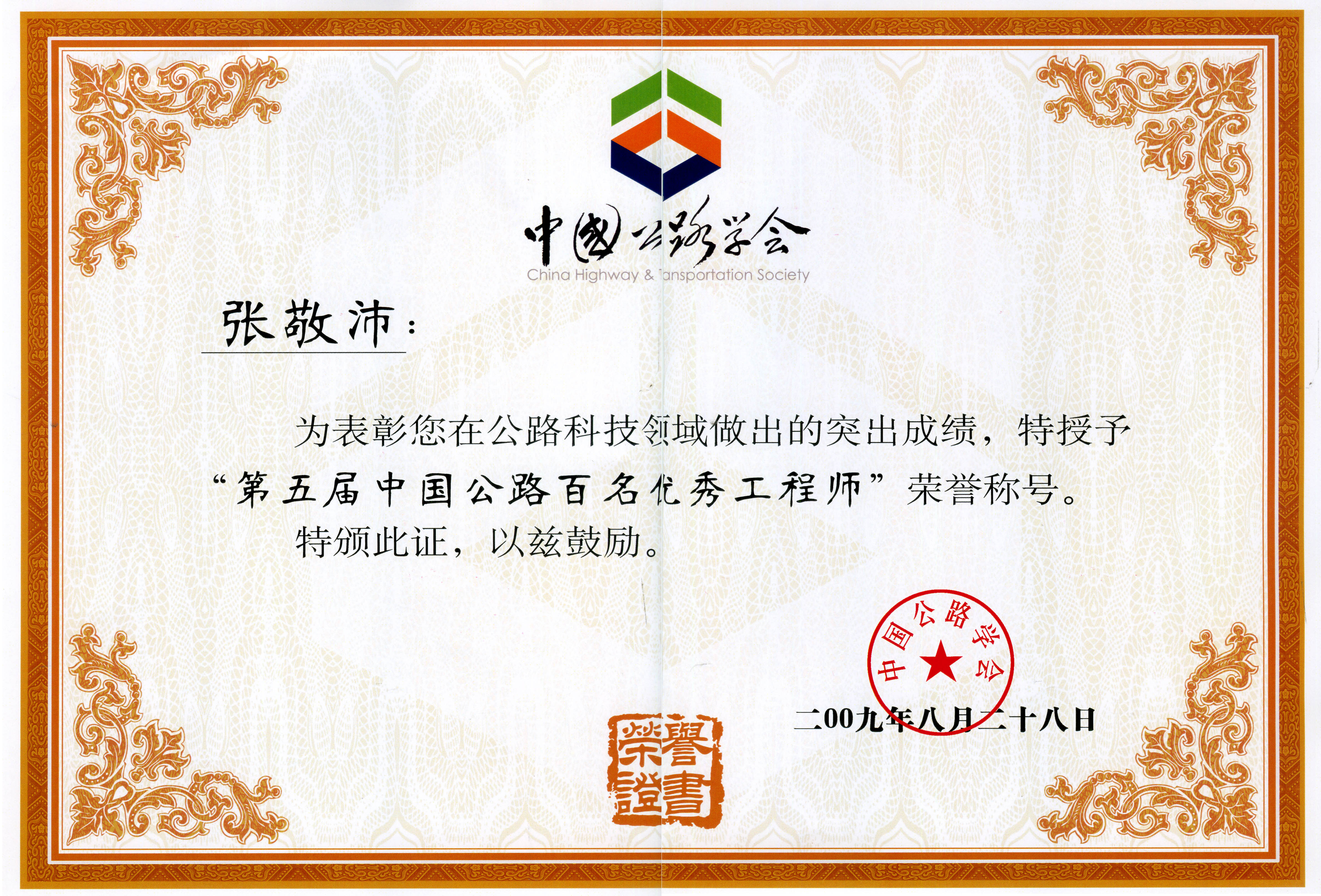 经中国公路学会评审,我公司张敬沛副总工程师被授予“第五届中国公路百名优秀工程师”荣誉称号,特此报喜。