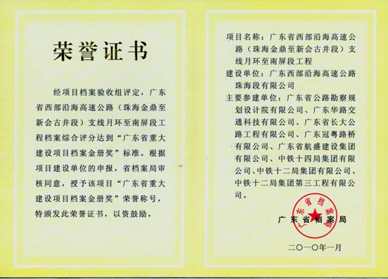 日前,由我司作为主要参建单位之一的广东省西部沿海高速公路(珠海金鼎至新会古井段)支线月环至南屏段工程项目档案荣获2009年“广东省重大建设项目档案金册奖”。 “广东省重大建设项目档案金册奖”由省档案局和省发改委2007年根据国家档案局和发改委的有关精神联合设立,2009年仅有两个项目获此殊荣。