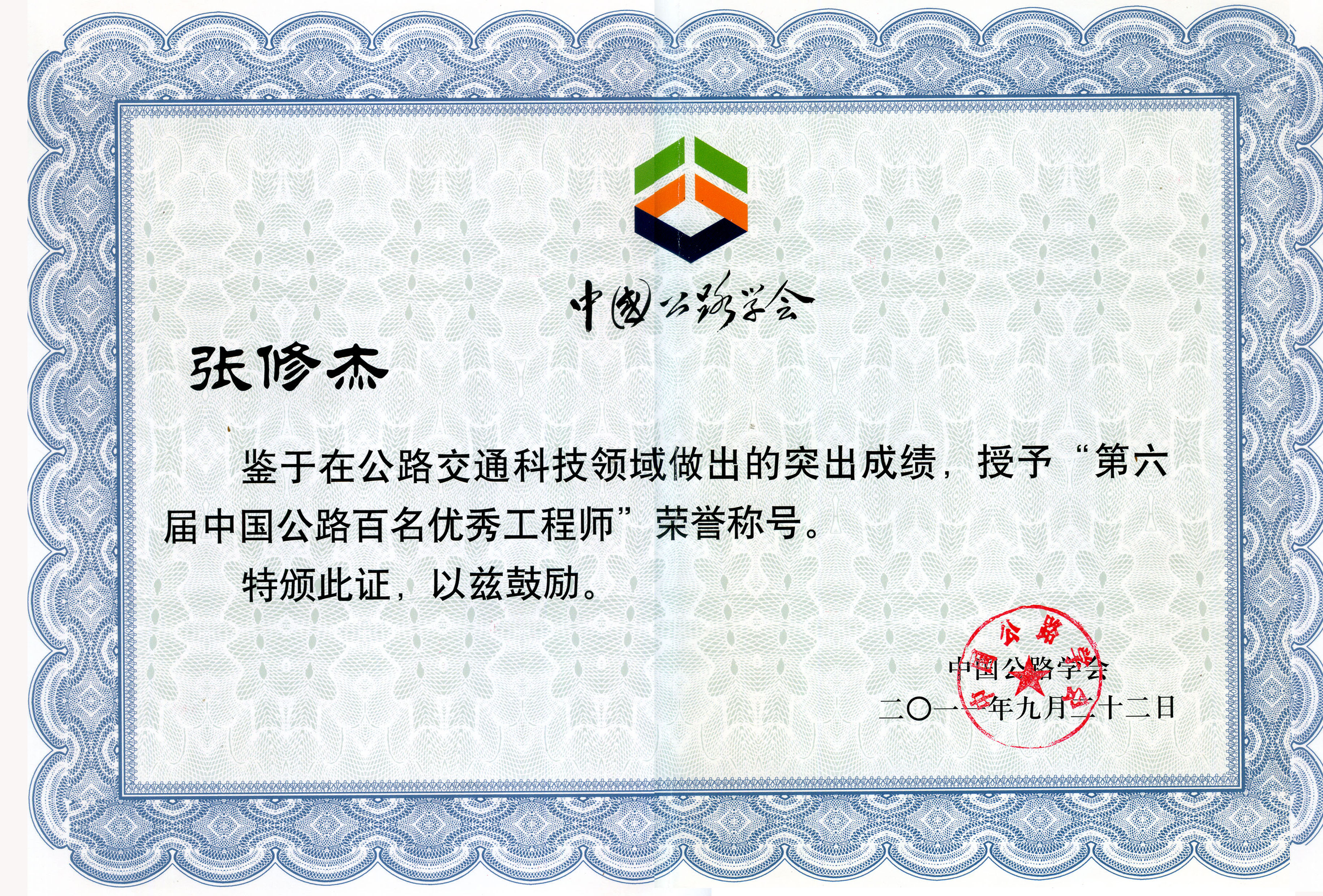 经中国公路学会评审,我公司张修杰副总工程师被授予“第六届中国公路百名优秀工程师”荣誉称号,特此报喜。