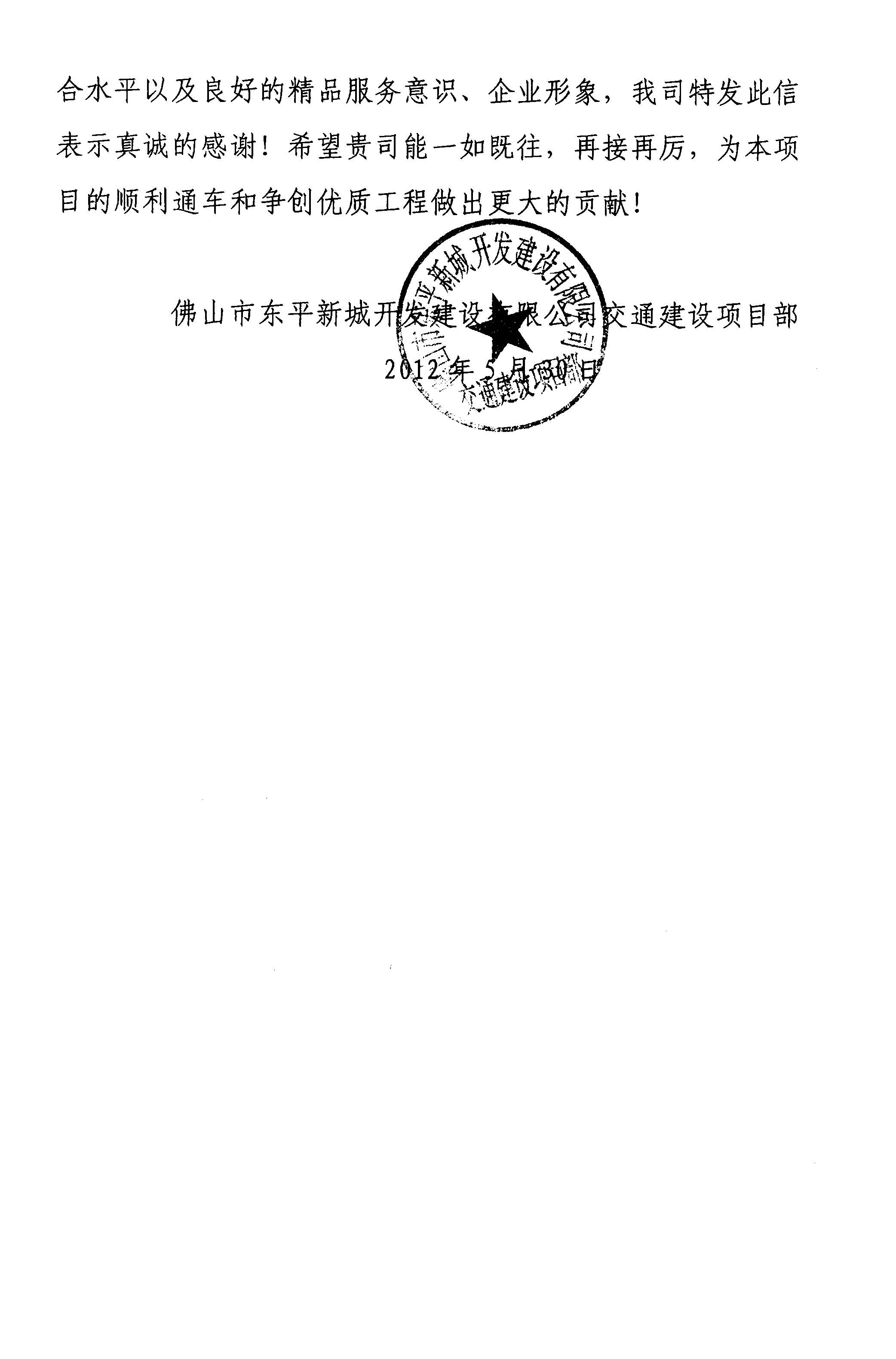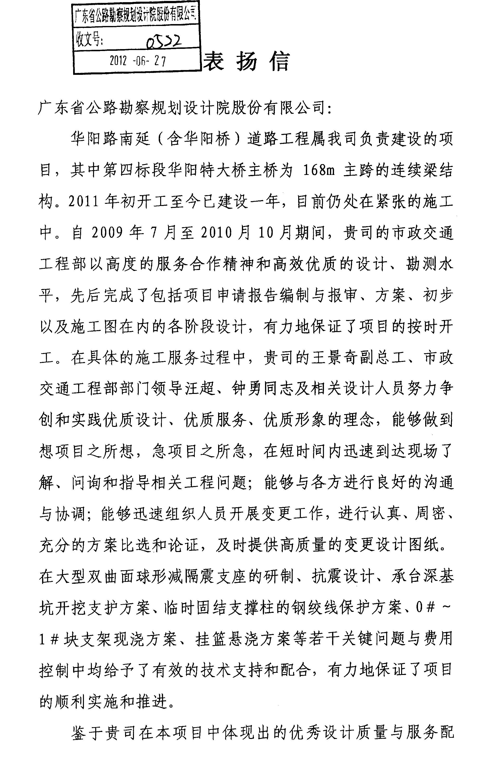 近日,公司收到业主单位佛山市东平新城开发建设有限公司交通建设项目部发来的表扬信,对市政与交通工程部在华阳路南延(含华阳桥)道路工程项目中表现出的“高度的服务合作精神和高效优质的设计、勘测水平”给予了充分肯定和高度赞扬。