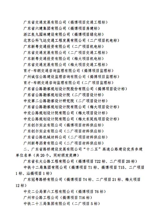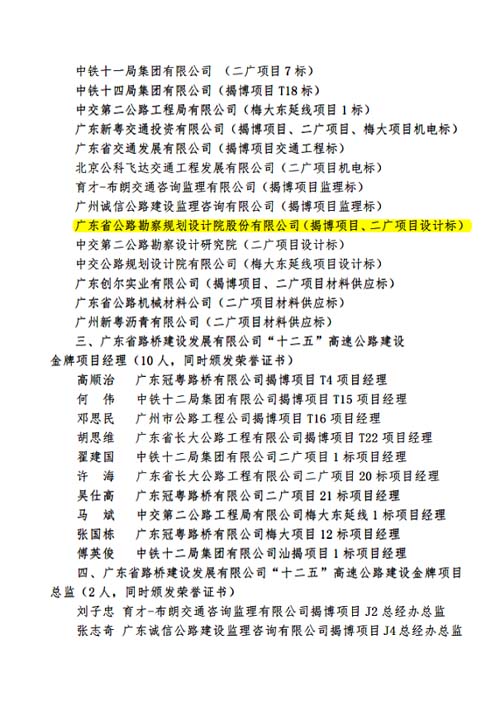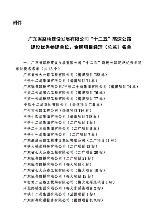 近日,广东省路桥建设发展有限公司召开了“省路桥公司‘十二五’期间建设成就表彰大会”,我公司因第三分公司负责设计的揭博高速公路和二广高速公路表现突出,被授予“广东省路桥建设发展有限公司‘十二五’高速公路建设优秀参建单位”荣誉称号。 特此报喜。