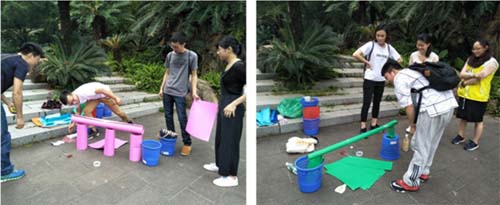 (队员们完成“水到渠成”任务:利用卡纸搭建桥梁,让乒乓球由指定一方到达另一方(桥梁要求最低离地50cm))