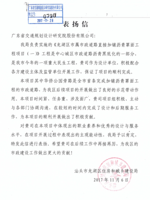 近日,汕头市龙湖区住房和城乡建设局发来表扬信,对我司在龙湖区市属市政道路直接加铺沥青罩面工程项目(一)中提供的优质、高效的设计及后服务表示感谢,对负责此次项目的市政设计分公司及项目团队给予了充分肯定,特此报喜!