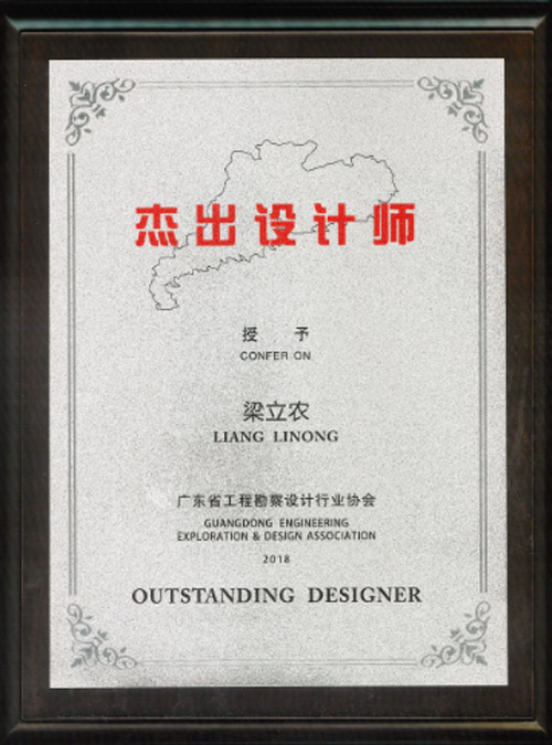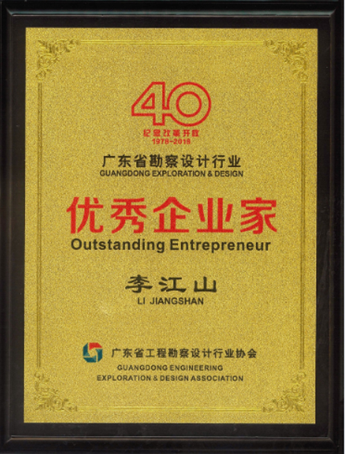 在广东省工程勘察设计行业协会举办的纪念改革开放40周年广东省勘察设计行业表彰活动中,我公司董事长李江山先生荣获广东省勘察设计行业优秀企业家称号,总工程师梁立农先生荣获广东省杰出设计师称号。